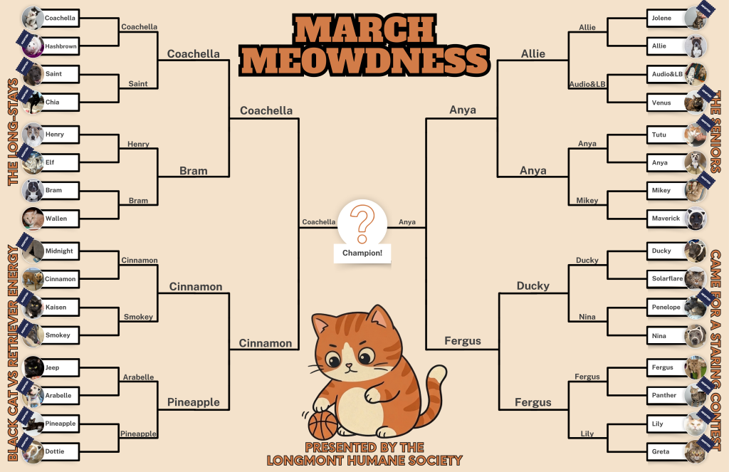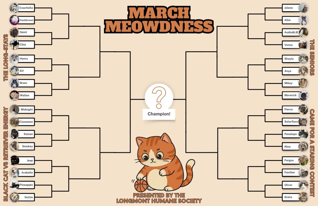 32 Longmont Humane Society animals compete head-to-head in a bracket-style tournament and you decide who wins. Every vote is a donation that goes directly toward caring for the animals. The last animal standing takes home a prize package of brand-new shelter goodies and yummies. Think March Madness, but with more fur and higher stakes.